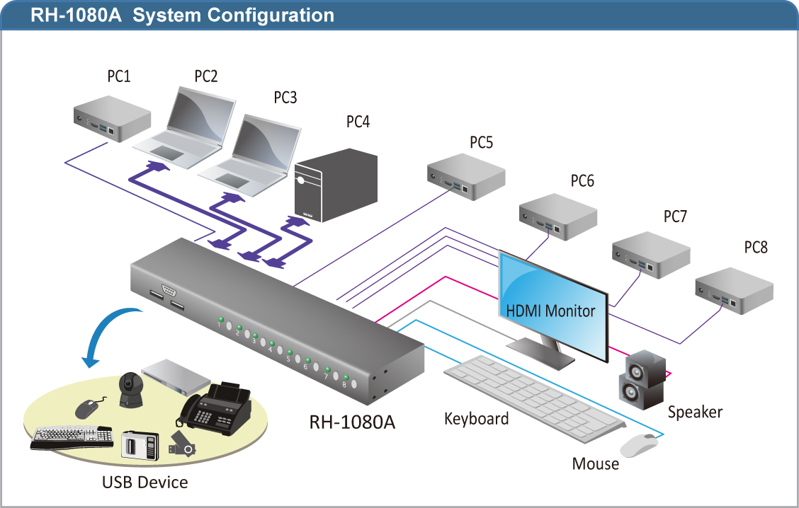 - 8-Port-Rackmontierbarer HDMI 2.0 KVM-Switch mit Audio, USB 2.0-Hub und Steurung über Hotkey.