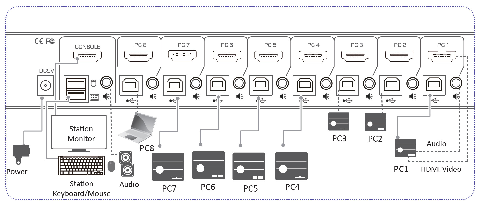 Benutzer können 8/16 Computer mit nur einer Tastatur, einer Maus, einem Monitor und einem Satz Lautsprecher/Kopfhörer steuern.