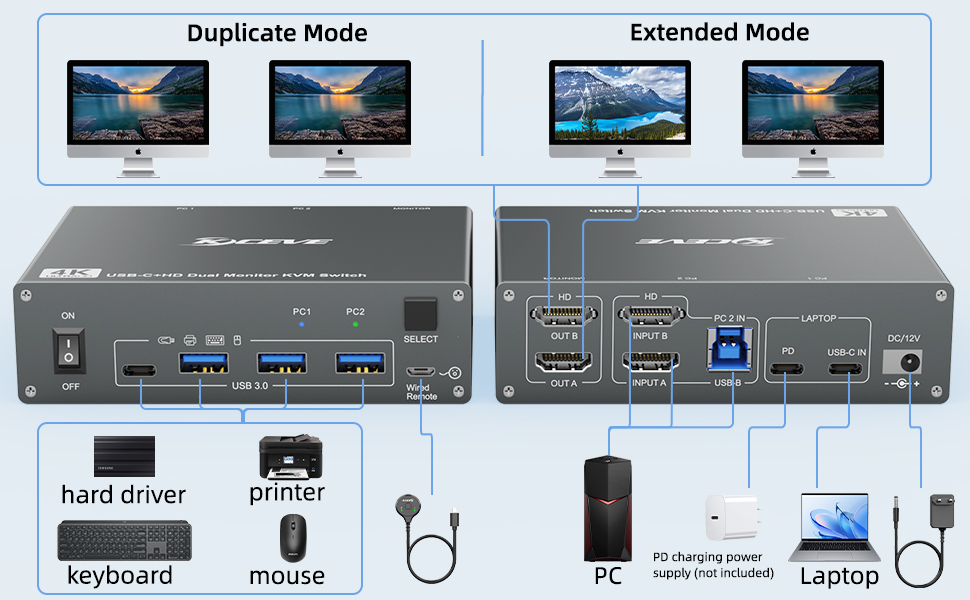 - Dieser Dual-Monitor KVM-Switch der USB 3.0-Version eignet sich für 1 Notebook und einen Computer, die sich 2 Monitore, Tastatur, Maus und USB-Geräte teilen. Bitte schließen Sie alle Kabel an, damit die beiden Displays ordnungsgemäß funktionieren.