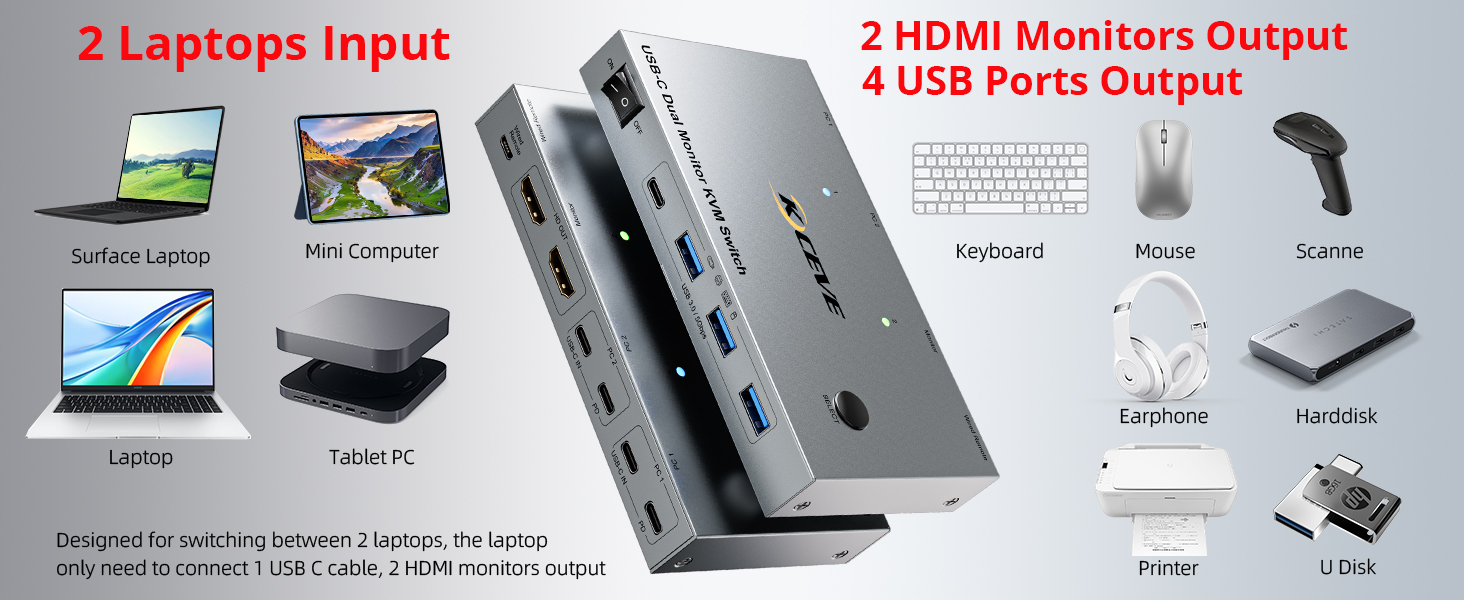 KCEVE USB-C KVM-Switch Dual Monitor HDMI 4K@60Hz für 2 Laptops