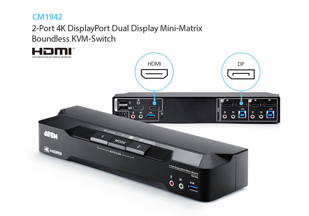 2-Port 4K DisplayPort Dual-Display Mini-Matrix Boundless KVM-Switch, Aten CM1942
