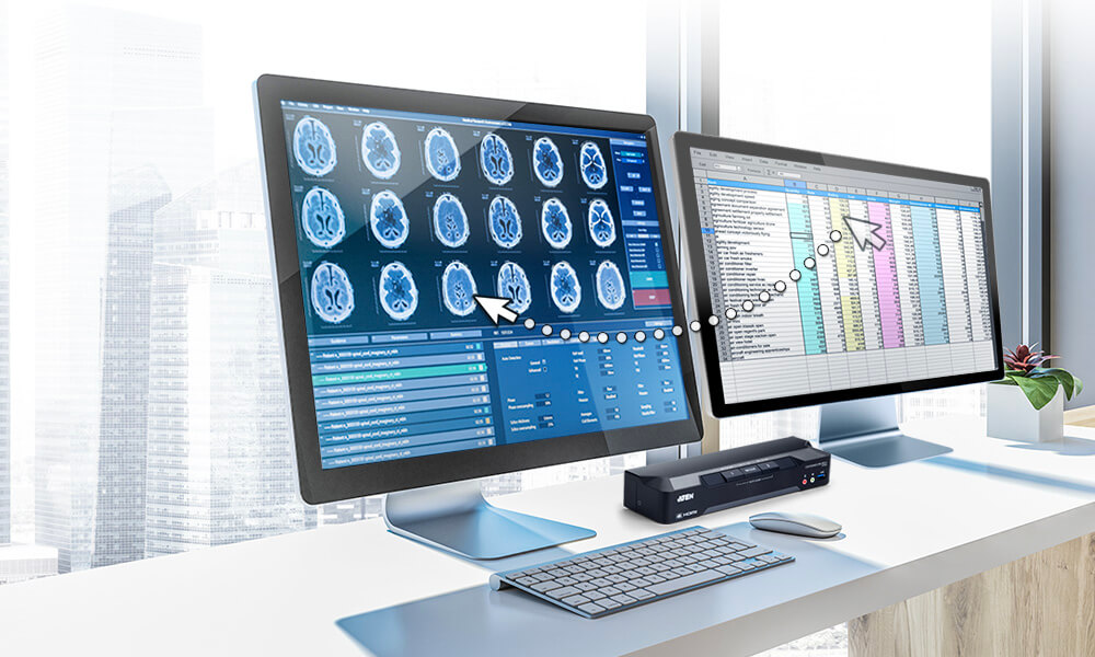 Der CM1942 ermöglicht ein schnelles Umschalten zwischen zwei Computern, indem er den Mauszeiger über die Bildschirmgrenzen hinweg sofort auf einen anderen Bildschirm bewegt, um einfach und unkompliziert zwischen den Quellen zu wechseln.