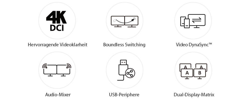 Der CM1942 ermöglicht den Anschluss von zwei DisplayPort-Computern und zwei HDMI-Displays und bietet so ein bemerkenswertes Benutzererlebnis mit außergewöhnlicher audiovisueller 4K-Verbesserung.