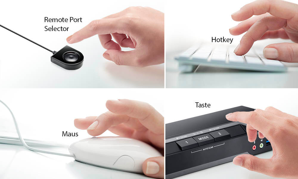 Die Portumschaltung mit dem CM1942 ist flexibel, und Sie können zwischen Drucktasten, Hotkeys, Maus und dem Remote Port Selector wählen, je nachdem, was für Sie und Ihre Arbeitsabläufe am besten geeignet ist.