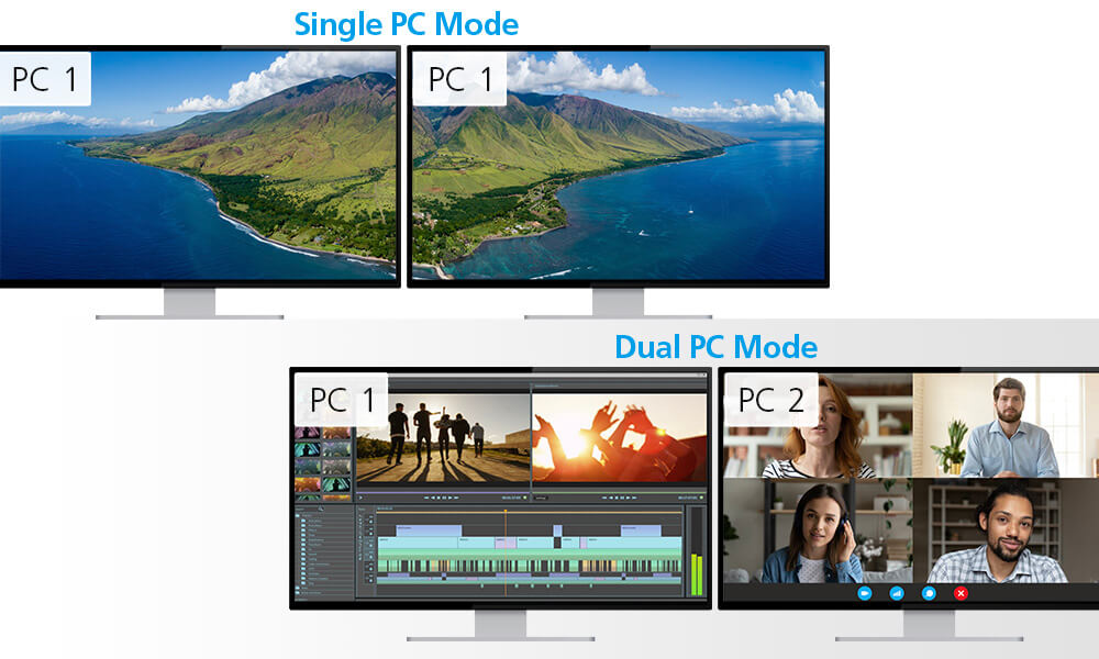 – Dual-PC-Modus – ermöglicht die getrennte Anzeige der Inhalte von zwei PCs auf zwei Bildschirmen, unabhängig vom KVM-Fokus