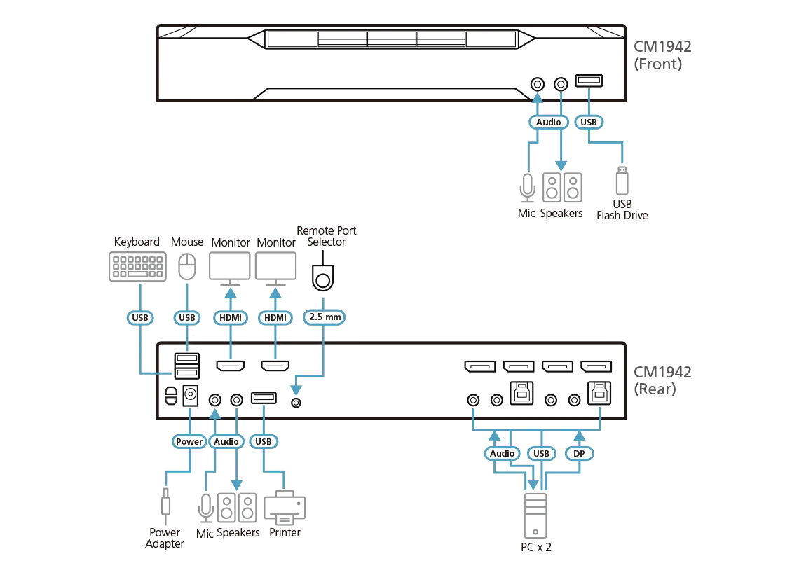 Der CM1942 2-Port 4K DisplayPort Dual Display Mini-Matrix Boundless KVM-Switch, der einen 2-Port DisplayPort-Switch und einen 2-Port USB 3.1 Gen 1-Hub kombiniert, wurde entwickelt, um sofortigen Zugriff auf zwei DisplayPort-Computer über eine einzige USB/HDMI-Konsole zu ermöglichen. Der CM1942 verfügt über zwei PC-Betriebsmodi, die das KVM-Switching in einer 2x2 PC/Monitor-Matrix erleichtern. Im Einzel-PC-Modus können die Inhalte des PCs mit dem aktuellen KVM-Fokus auf beiden Bildschirmen angezeigt werden; im Dual-PC-Modus hingegen können die Inhalte beider PCs unabhängig vom KVM-Fokus auf zwei Bildschirmen angezeigt werden.