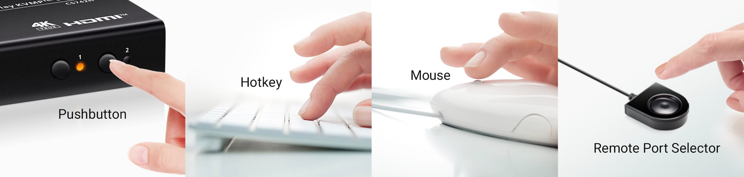 Das Umschalten zwischen Ports erfolgt schnell und flexibel über Drucktasten, Hotkeys, Maus oder den Remote-Port-Selektor – je nachdem, was am besten zu Ihrem Arbeitsablauf passt.