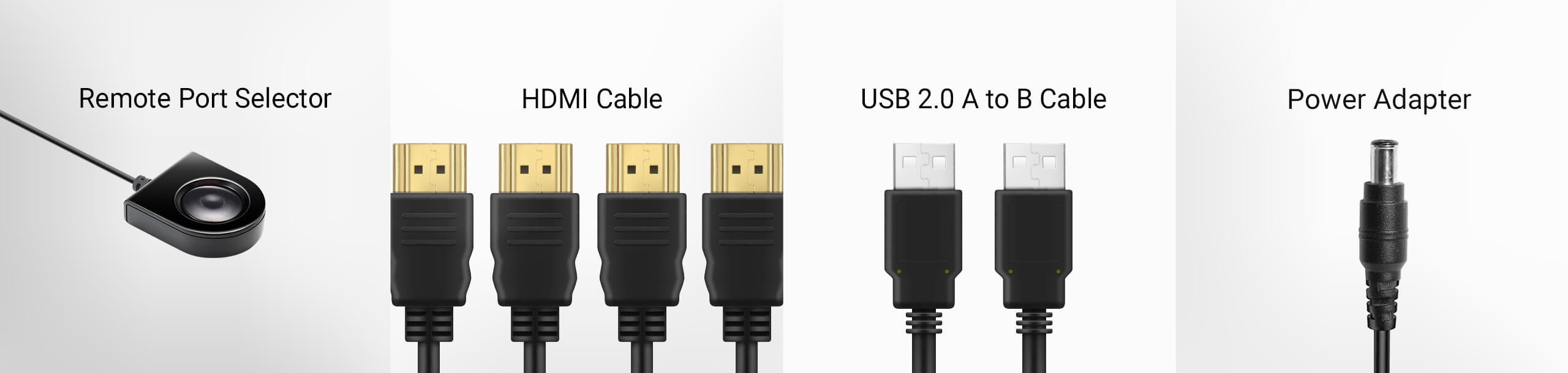 Alles, was Sie benötigen, ist im Lieferumfang enthalten – 4 HDMI Kabel, 2 USB 2.0 A-zu-B-Kabel, 1 Netzteil und 1 Fernbedienungs-Port-Selektor (kabelgebundener Schalterknopf) – für eine sofortige Einrichtung.