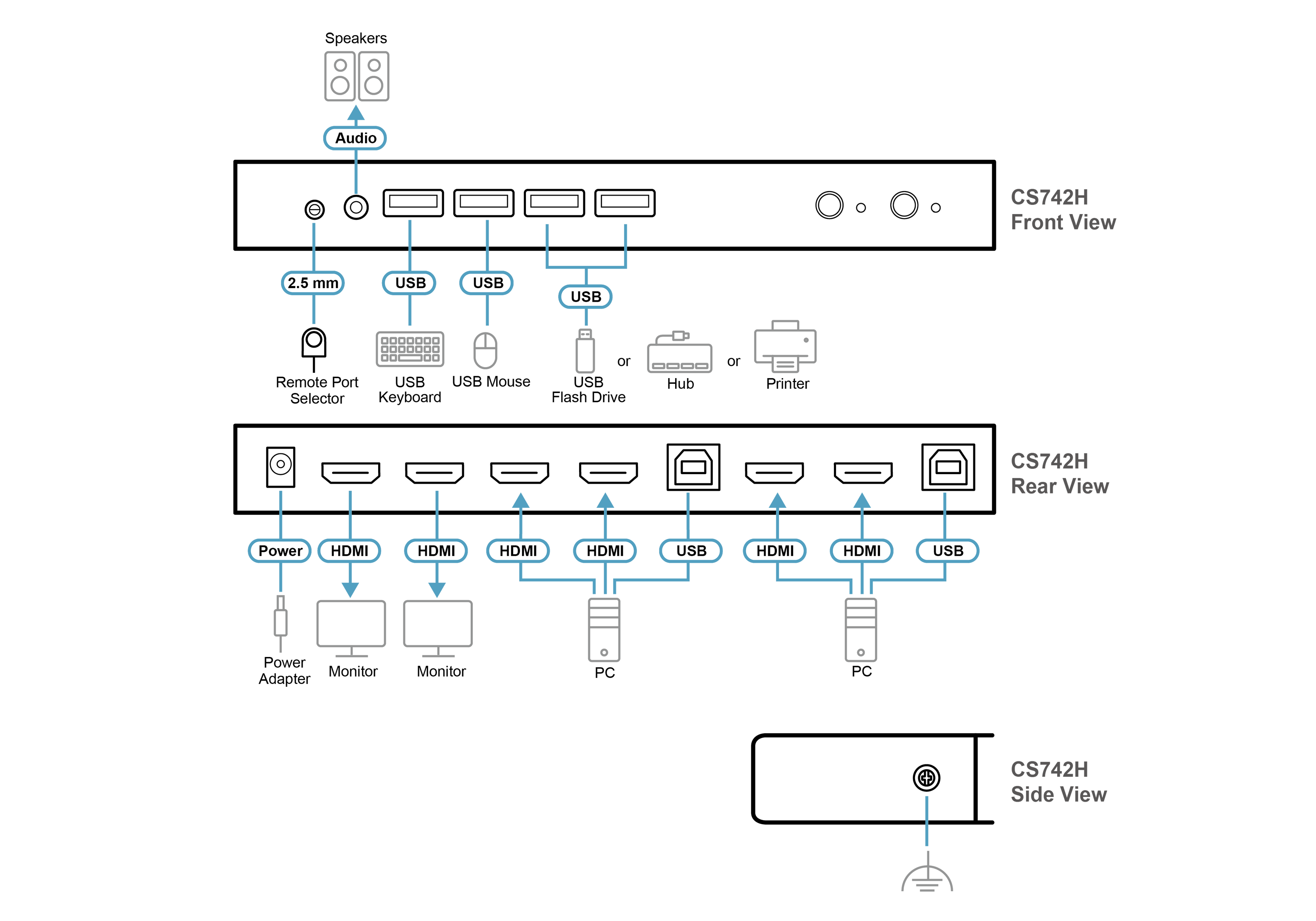 Mit dem CS742H können Benutzer beide Systeme über eine einzige USB-Tastatur, eine Maus und geteilte Peripheriegeräte bedienen, wodurch die Unordnung auf dem Schreibtisch und die Hardwarekosten erheblich reduziert werden. Er unterstützt mehrere Umschaltmethoden, darunter Drucktasten an der Vorderseite, Hotkeys, Mausrad und Fernport-Selektor, und bietet so Flexibilität und Komfort in verschiedenen Arbeitsumgebungen. Ausgestattet mit USB-Peripheriegerätefreigabe ermöglicht der CS742H die nahtlose Nutzung von Geräten wie externen Laufwerken, Webcams oder Druckern auf beiden verbundenen Systemen.