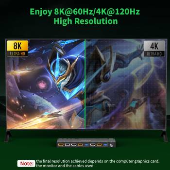 Dieser 2x 8K bis 60Hz bzw. 2x 4K 3840x2160 bis 120Hz / 5K 5120x1440 bis 120Hz Split+Dual-Monitor HDMI KVM-Switch ist für moderne Hochleistungsmonitore geeignet.