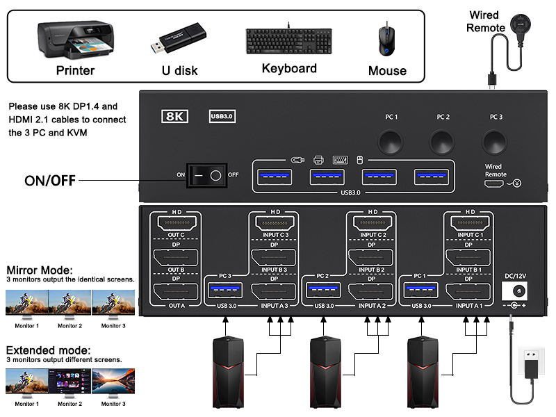 3-Port, Dreifach-Monitor (1x HDMI 2x DP) 8K oder 4K bis 144Hz KVM-Switch mit 4-Port USB 3.0, KC-KVM303DH