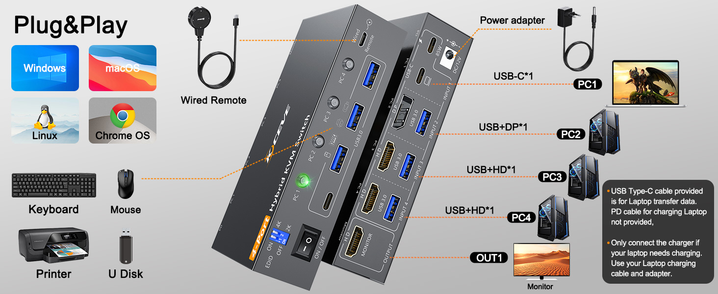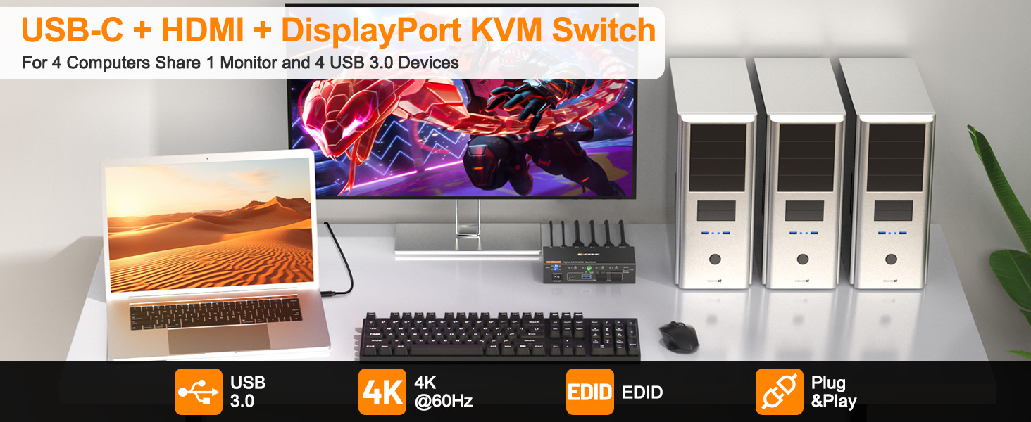 Der 4-Port KCEVE USB 3.0 KVM-Switch für 4 Rechner eignet sich für den Anschluss von 4 Computern (1x USB-C, 1x DP/USB, 2x HDMI/USB) an einen HDMI-Monitor und USB (Tastatur/Maus etc.) Peripherie.
