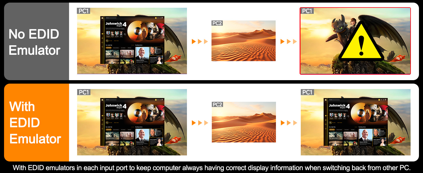 - EDID-Emulator: Der 4-Port-KVM-Switch unterstützt EDID-Sperre. Die EDID-Funktion ist sehr nützlich, da sie die Monitoreinstellungen automatisch an die optimale Auflösung und Bildwiederholfrequenz anpasst. So erhalten Sie immer die beste Bildqualität. Beim Wechseln der Bildschirme wird das Originalfenster nicht beschädigt. Sie können die EDID-Funktion ein- oder ausschalten. Je, nachdem, ob Sie möchten, das die Monitorinhalte auf z.B. den Notebook-Bildschirm springen (aus) oder nicht (EDID an), wenn Sie vom Notebook weg-schalten.