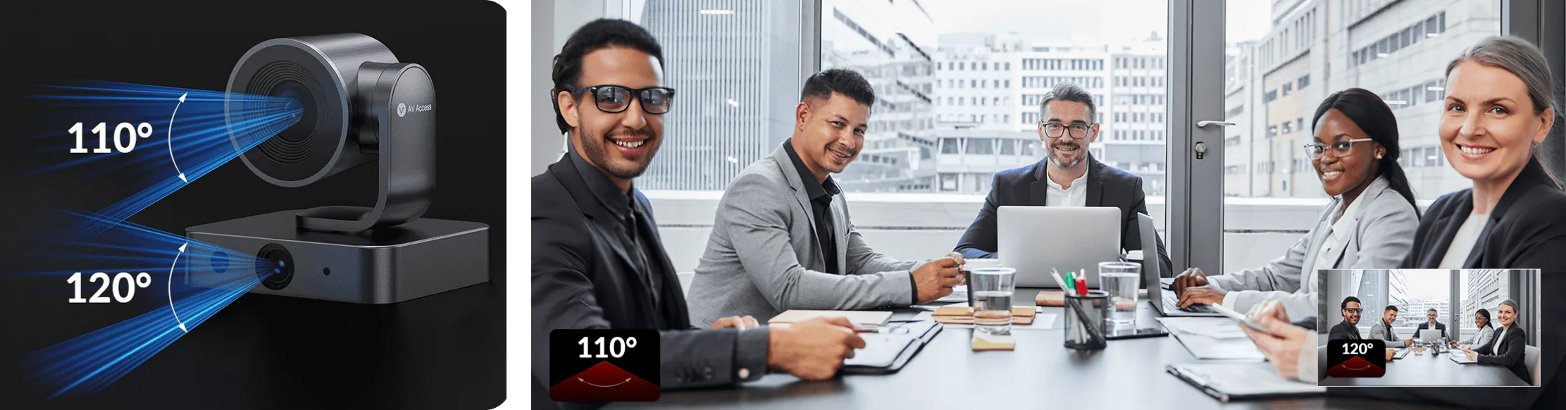 Ein 120°-Panoramaobjektiv erfasst den gesamten Raum, während eine 110°-PTZ-Kamera in Echtzeit zoomt und verfolgt. Klar, fokussiert und immer auf den Punkt.
