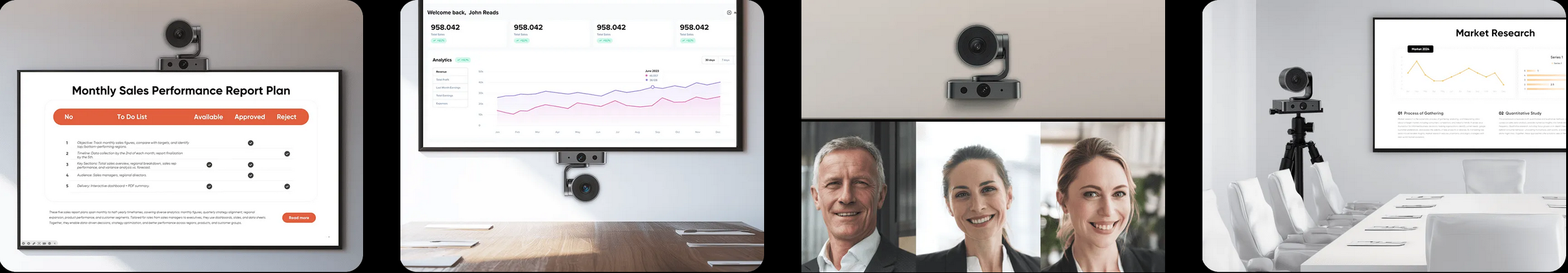 Montieren Sie es mühelos auf einem Bildschirm, unter einem Bildschirm, an einer Wand oder auf einem Stativ. Passt sich an jeden Besprechungsraum an.