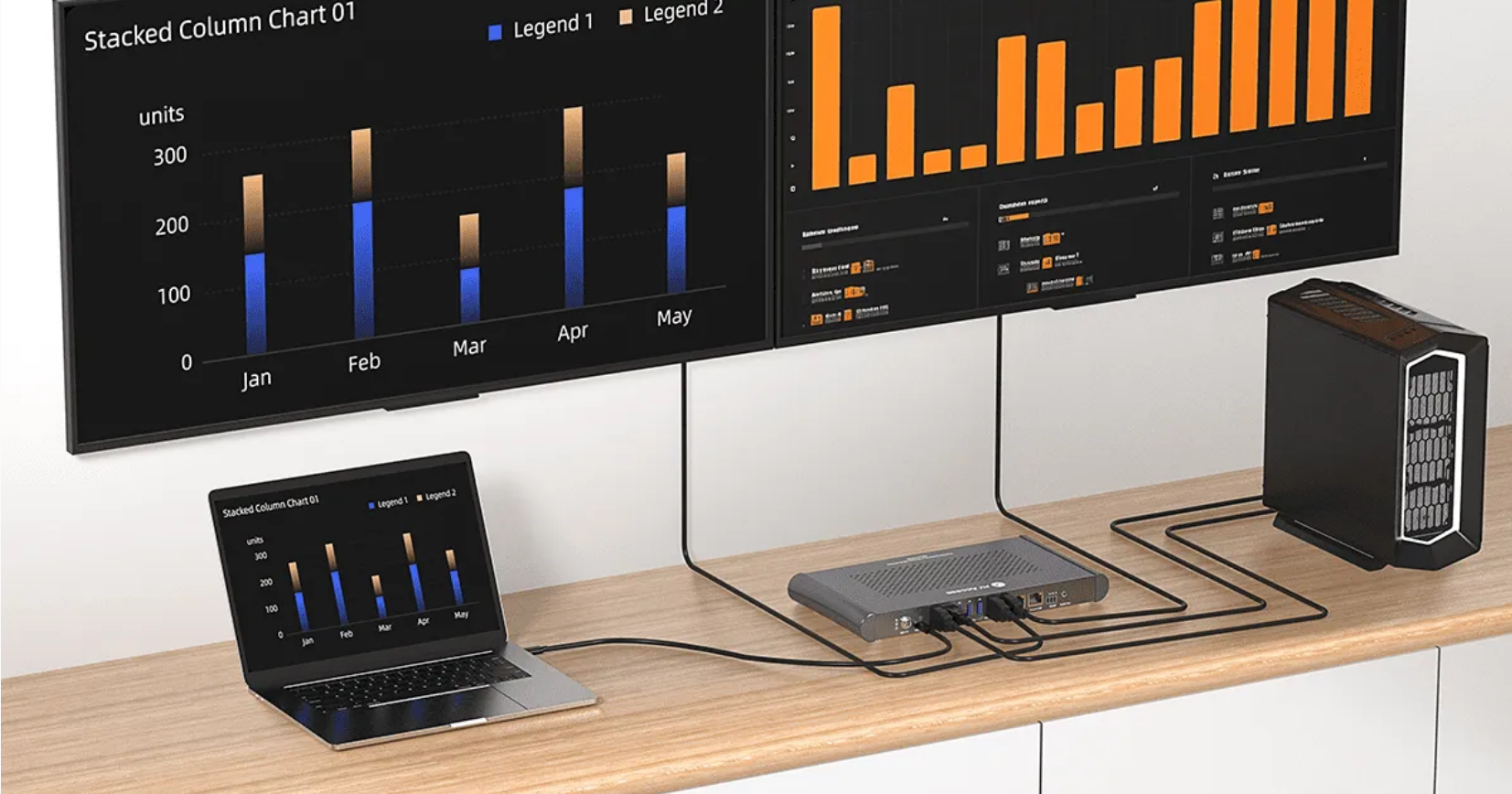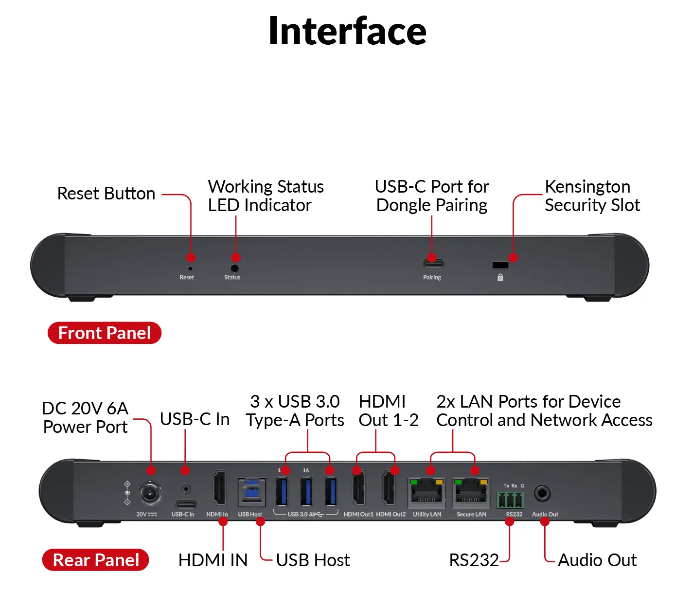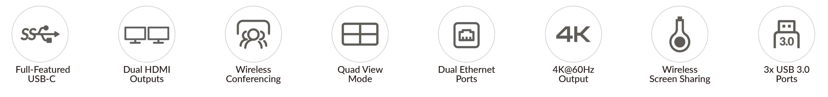 ● All-in-One USB-C Anschluss: Ein Kabel für Audio/Video, 5-Gbit/s-Datenübertragung, Netzwerkzugriff und 65-W-Laden des Laptops. ● Dual-HDMI Output: Schließen Sie zwei Monitore für klare und effiziente Präsentationen an. ● Quad-View Mode: Zeigen Sie bis zu vier Quellen auf einem Bildschirm an, um den Vergleich und die Zusammenarbeit zu vereinfachen. ● One-Click Wireless Conferencing: Steuern Sie USB 3.0-Konferenzgeräte sofort mit dem eShare D30 Dongle (Hinweis: Für drahtlose Konferenzen ist eine Softwareinstallation erforderlich. Wenn Sie einen Computer zum ersten Mal mit dem eShare D30 verbinden, wird eine Aufforderung zur Installation der eShare-App angezeigt). Hinweis: Es ist kein eShare-D30 Dongle im Lieferumfang enthalten. ● Multiple Casting Options: Teilen Sie Inhalte über HDMI/USB-C oder drahtlos mit AirPlay, Miracast und Dongle. ● Reibungslose und zuverlässige Konnektivität: Unterstützt sowohl kabelgebundene als auch kabellose Bildschirmfreigabe für flexible Meeting-Setups. Plug-and-Play, keine Installation von Software und Treibern für Screencasting erforderlich. ● Dual-Gigabit Ethernet Ports: Separate interne und Gastnetzwerke für mehr Sicherheit und Komfort.