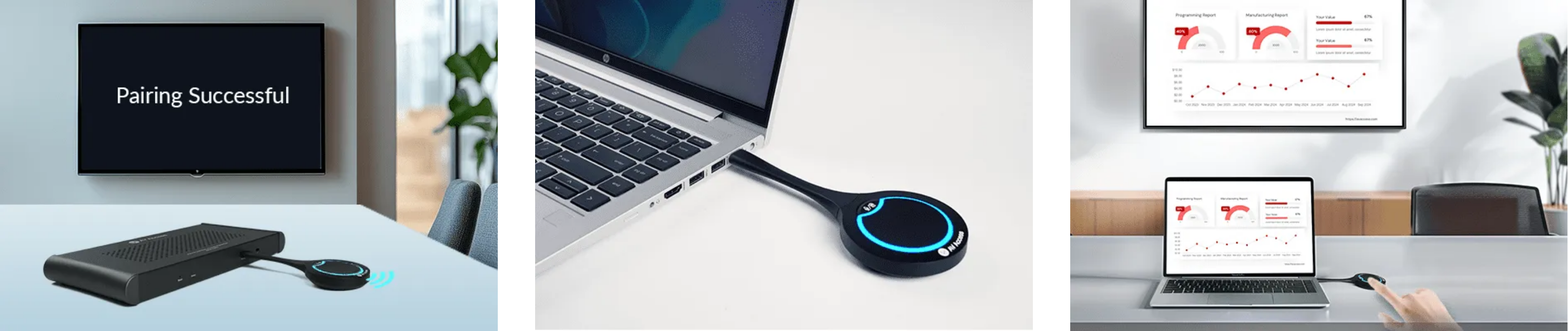 Kombinieren Sie eShare W90 mit dem eShare D30-Dongle für nahtlose Hybrid-Meetings. Nach der Installation der eShare-App drücken Sie einfach die Taste am Dongle, um alle USB-Peripheriegeräte (Kamera, Freisprecheinrichtung, Videobar) drahtlos zu steuern – ganz ohne Kabelsalat. Genießen Sie mühelose Videomeetings mit nur einem Klick!