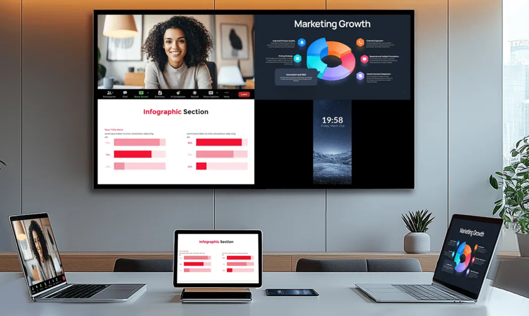 Der eShare W90 unterstützt den Quad-View-Modus, sodass bis zu vier Quellen gleichzeitig auf einem Bildschirm angezeigt werden können. Perfekt für Vergleiche, Brainstorming-Sitzungen und eine verbesserte Teamzusammenarbeit in Meetings.