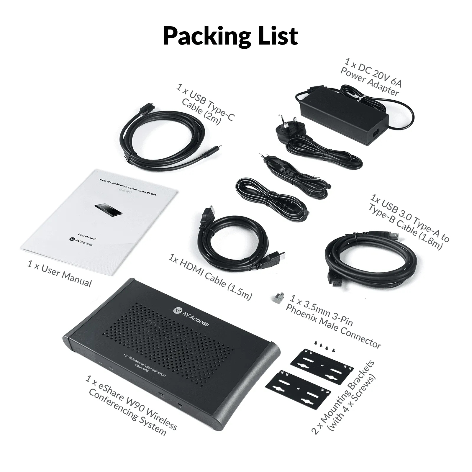 Der voll funktionsfähige USB-C-Anschluss des eShare W90 liefert bis zu 65 W Ladeleistung und überträgt gleichzeitig Video, Audio, USB-Daten und Netzwerksignale. Schließen Sie einfach ein Kabel an Ihren Laptop an und genießen Sie ein nahtloses und störungsfreies Meeting-Erlebnis.