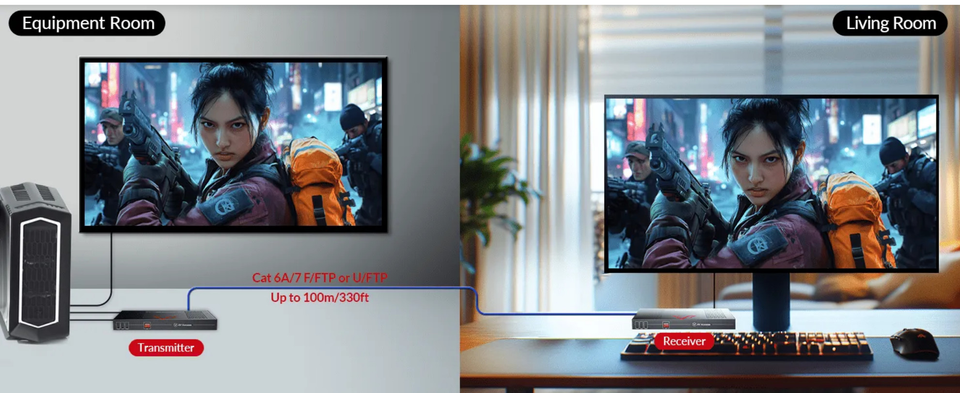 Übertragen Sie einfach hochwertiges 4K DisplayPort-Signal bis zu 100m mit einem einzigen Cat 6A/7 F/FTP- oder U/FTP-Kabel.
