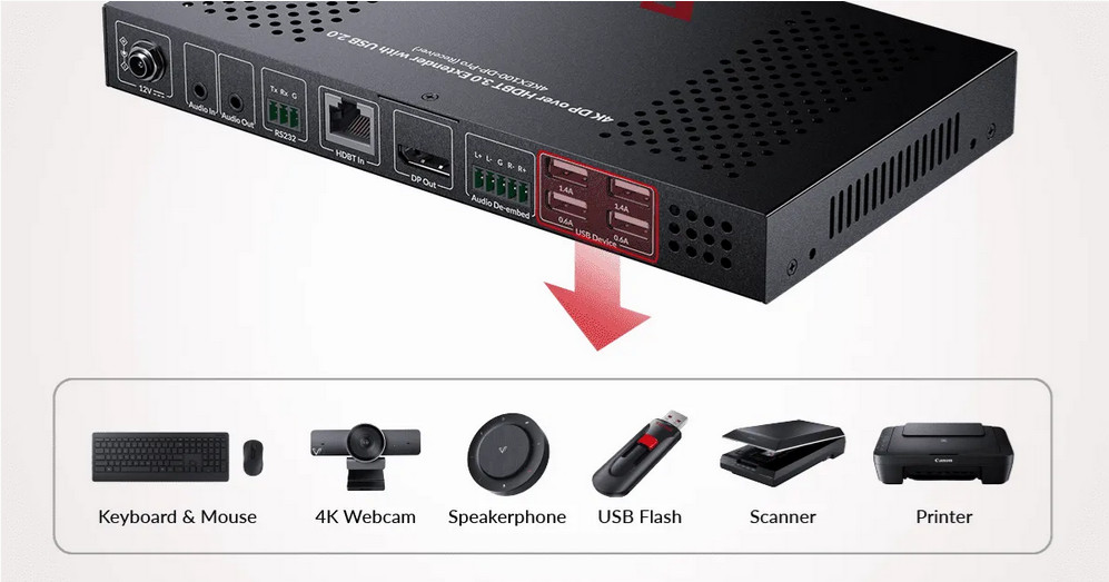 Dieser Extender unterstützt bis zu 4 USB 2.0-Peripheriegeräte und ermöglicht eine einfache Steuerung von Tastaturen, Mäusen, Webcams und mehr. |