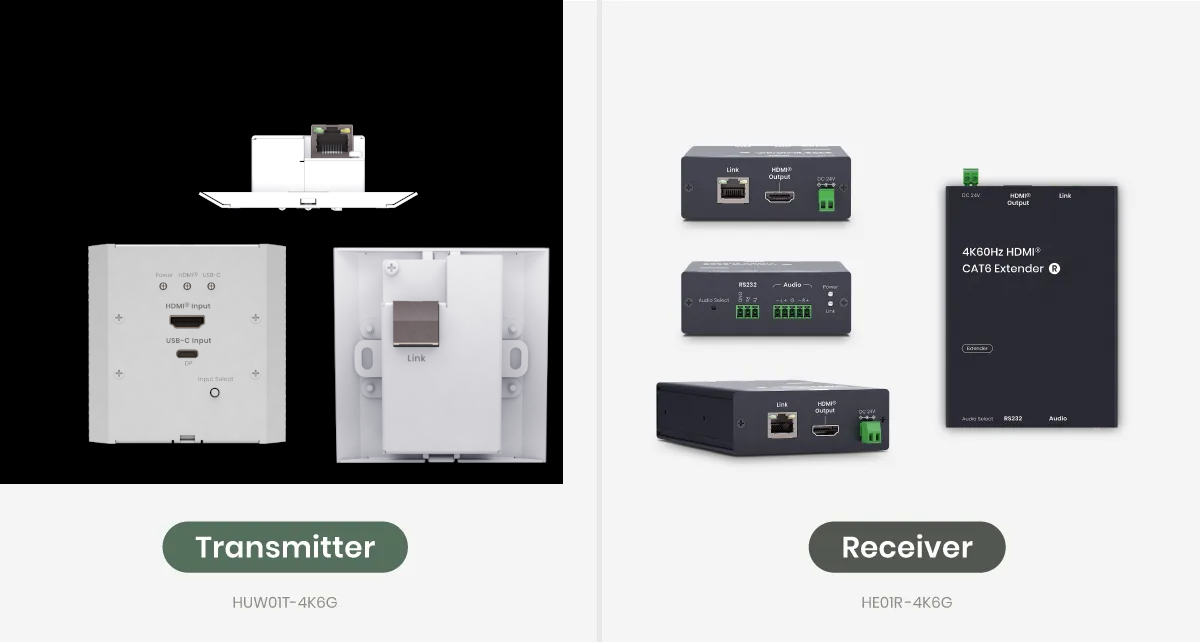 Der Extender verwendet die PoC-Technologie, um den HDMI-Wandplattensender über dasselbe CAT6-Kabel mit Strom zu versorgen. Nur der Empfänger muss an ein Netzteil angeschlossen werden. Dies vereinfacht die Installation erheblich und hält die Wandflächen sauber und ungehindert.