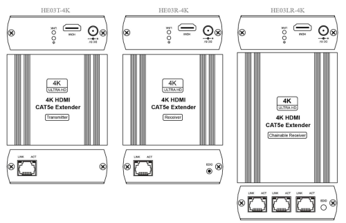 - Der HE03R-4K ist der Receiver, der das Signal entgegen nimmt und auf bis zu 120 Meter entfernt wieder über HDMI ausgibt.