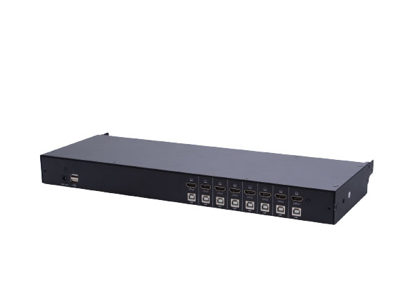 Eine vollwertige Tastatur mit Nummernblock inklusive Touchpad, sowie acht HDMI und USB (A/B) Anschlüsse runden das Bild ab. Das Gehäuse entspricht dem 1HE Standard und ist einfach mit den mitgelieferten Einbauwinkeln montierbar. Einbautiefe 611mm