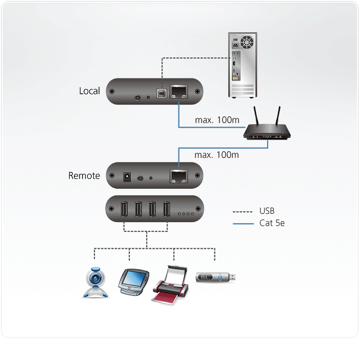 Der UEH4102 4-Port USB 2.0 Extender over LAN verfügt über die patentierte ExtremeUSB® Technologie, die es dem Anwender ermöglicht, die standardmäßige Kabellänge von 5 Metern für USB-Peripheriegeräte zu überschreiten.