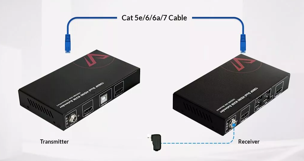 Der Sender kann über das Cat-Kabel vom Empfänger mit Strom versorgt werden, sodass auf der Empfängerseite nur ein Netzteil erforderlich ist, um beide Einheiten mit Strom zu versorgen.