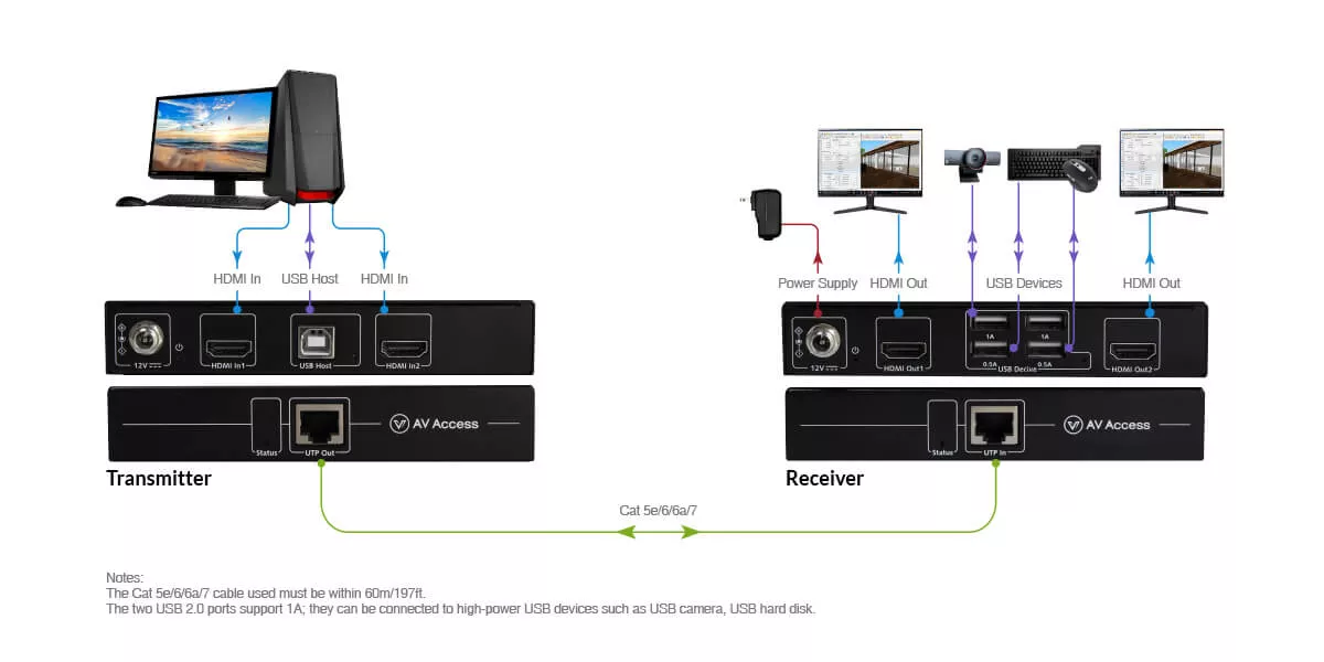 Der HDMI-KVM-Extender ist mit vier USB-2.0-Geräteanschlüssen am Empfänger ausgestattet und ermöglicht die Verlängerung von Maus, Tastatur, Drucker, Scanner oder anderen USB-2.0-Geräten bis zu 60 m. Zwei der USB-Anschlüsse unterstützen einen höheren Ausgangsstrom von 5 V/1 A, sodass Sie problemlos leistungsstarke USB-Geräte wie eine USB-Kamera oder eine USB-Festplatte anschließen können.