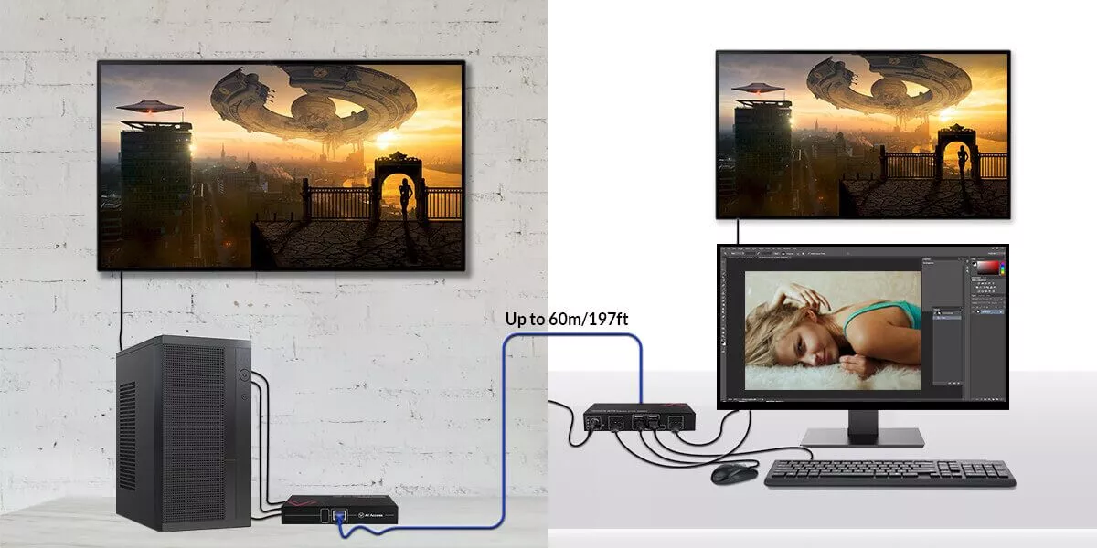 - Verlängert 2x HDMI- und USB-Signale bis zu 60 m ohne Latenz