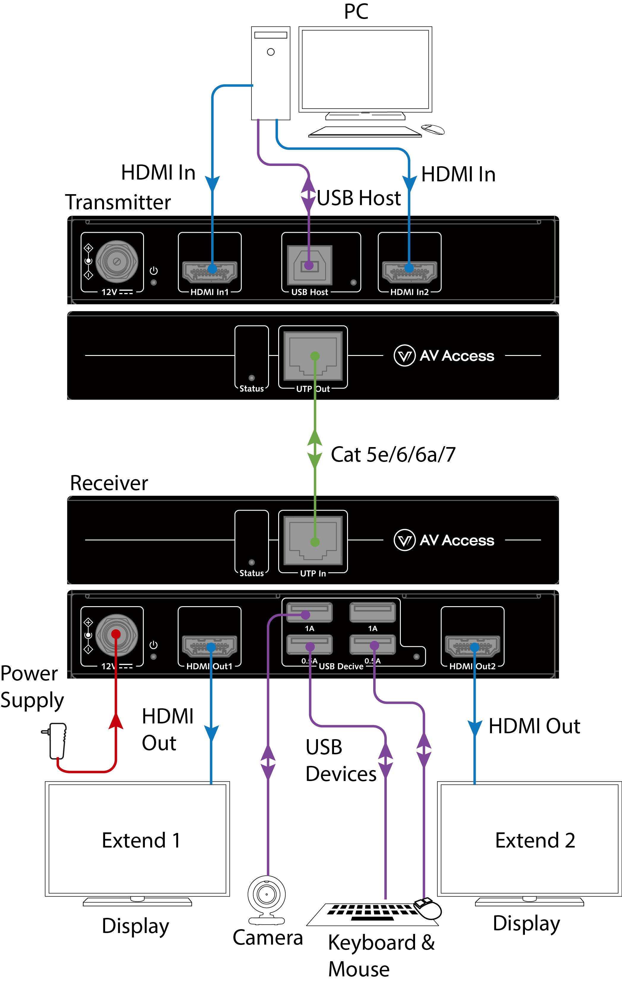 Mit der integrierten PoC-Funktion kann der Sender über ein Cat-Kabel vom Empfänger mit Strom versorgt werden, sodass auf der Empfängerseite nur ein Netzteil zur Stromversorgung beider Einheiten benötigt wird. Es bietet Ihnen mehr Komfort bei der Installation auf der Quellseite.
