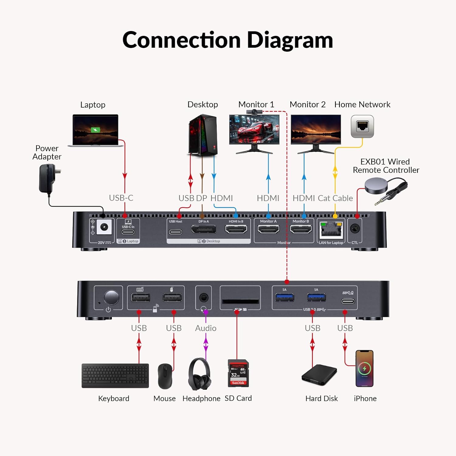 - KVM-Dockingstation für Laptop und Desktop: Steuern Sie Ihren USB-C Laptop und Ihren HDMI/DP-Desktop ganz einfach mit einem Set aus Tastatur, Maus und zwei Monitoren. Diese leistungsstarke KVM-Dockingstation ermöglicht nahtloses Umschalten zwischen PC und Notebook und eignet sich somit perfekt für Produktivitäts- und Entertainment-Setups.