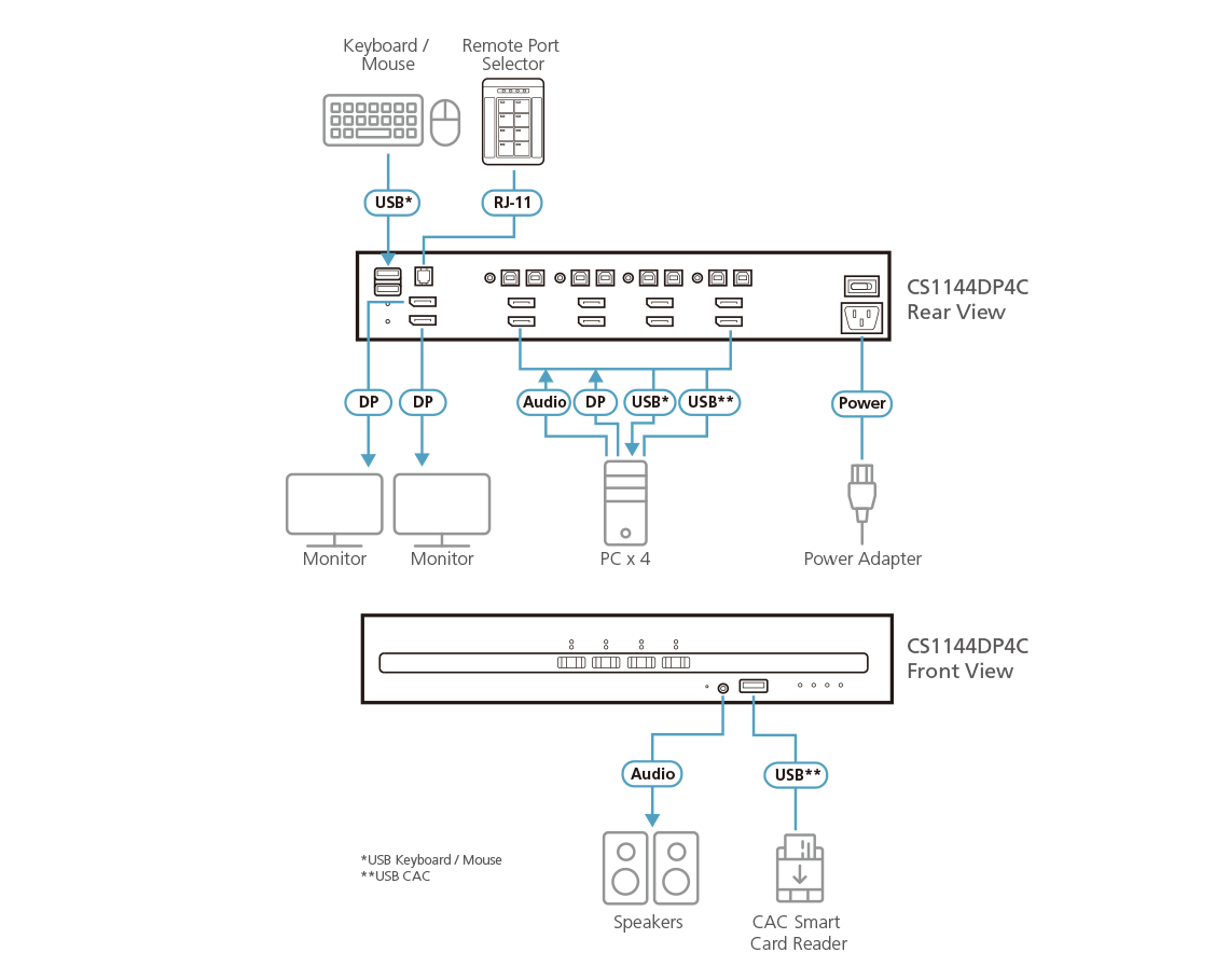 1x CS1144DP4C 4-Port USB DisplayPort Dual Display Secure KVM Switch with CAC