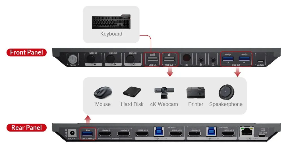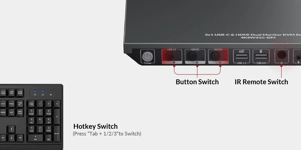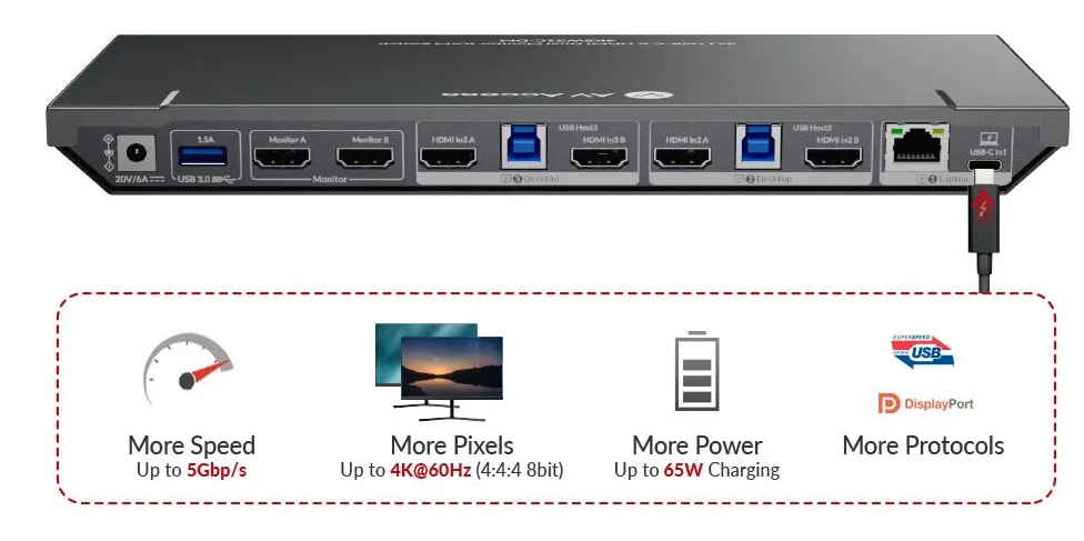 Dieser 3×1-KVM-Switch ist mit 1x USB-C-Eingangsanschluss (Multi-Stream-Transport) für Laptops und 4x HDMI-Eingangsanschlüssen (2 Anschlüsse in einer Gruppe) für Desktop-Computer ausgestattet.
