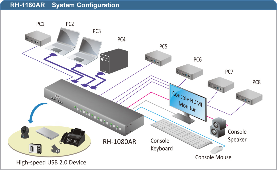 The RH-1080A/RH-1160A support multimedia keyboard and mouse. Multi-platform support such as PC and Mac. is also available. It features the specification of HDMI 2.0, not only a popular display interface of consumer electronics but also the increased bandwidth, compared with the previous versions of HDMI 1.4.