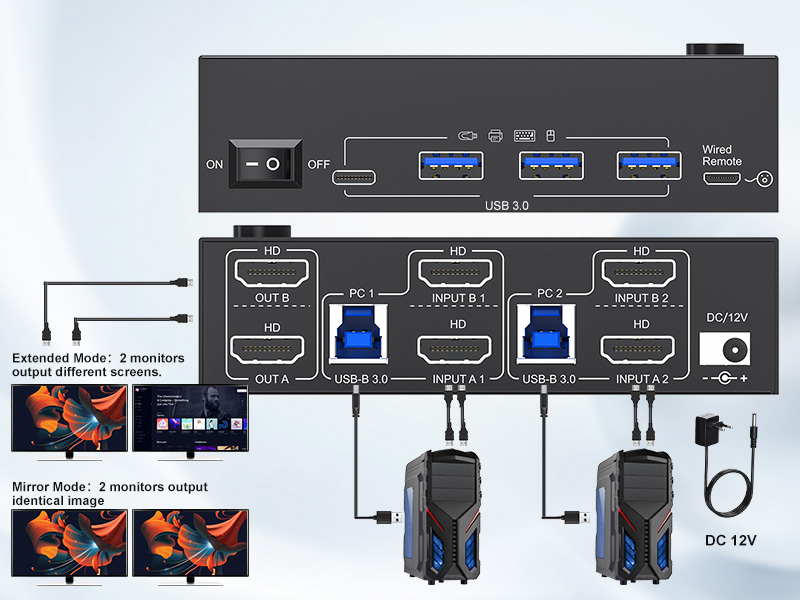 The USB3.0 Dual Monitor HDMI KVM Switch is specially designed for users with 2 PCs and 2 monitors.