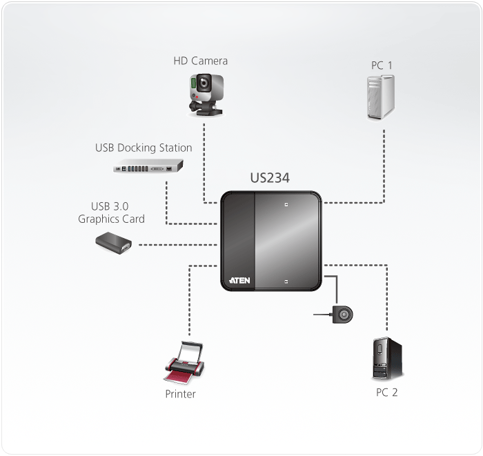 ATEN US234 is a 2-port USB 3.0 peripheral sharing device that allows users to share four USB devices between 2 different computers. US234 is USB 3.0 compliant, which can support data transfer rate up to 5Gbps and backwards compatible with USB 2.0 and USB1.1. It is perfect for high-bandwidth devices, such as USB docking stations or HD cameras.