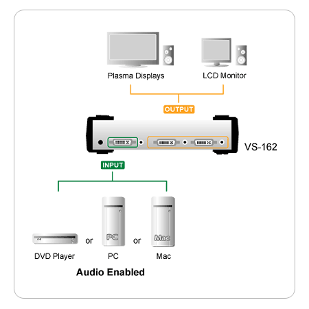 VS162 KVM Splitter provides DVI video and audio input signals to 2 DVI video and audio outputs after duplication and boosting. They are ideal for any type of broadcasting environment, classrooms, or by power computer users.