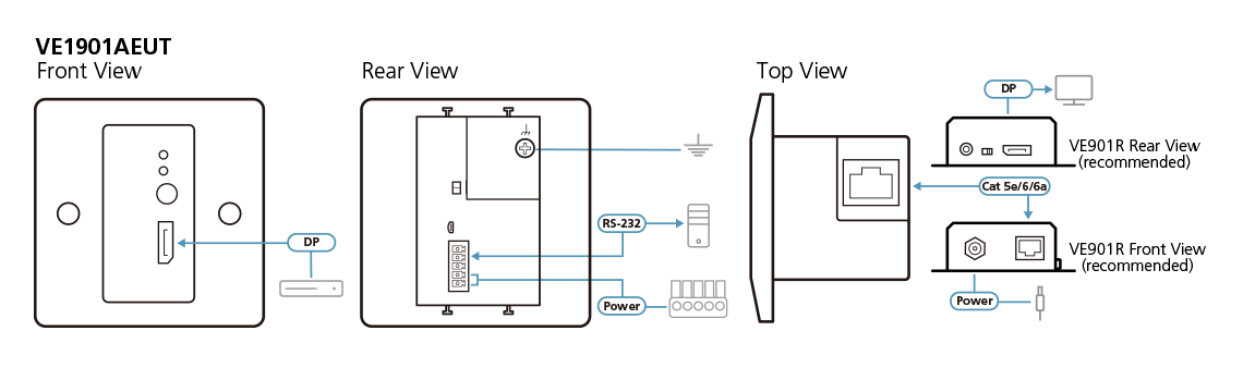 The VE1901AEUT can be easily mounted in a 1-gang junction box with EU wall plate, concealing bulky cable setups and presenting the needed information in sight. In addition, with built-in PoH (Power over HDBaseT) function, the VE1901AEUT receives power supply from a connected PoH PSE (Power Source Equipment) supported receiver and streamlines complex power line deployment.