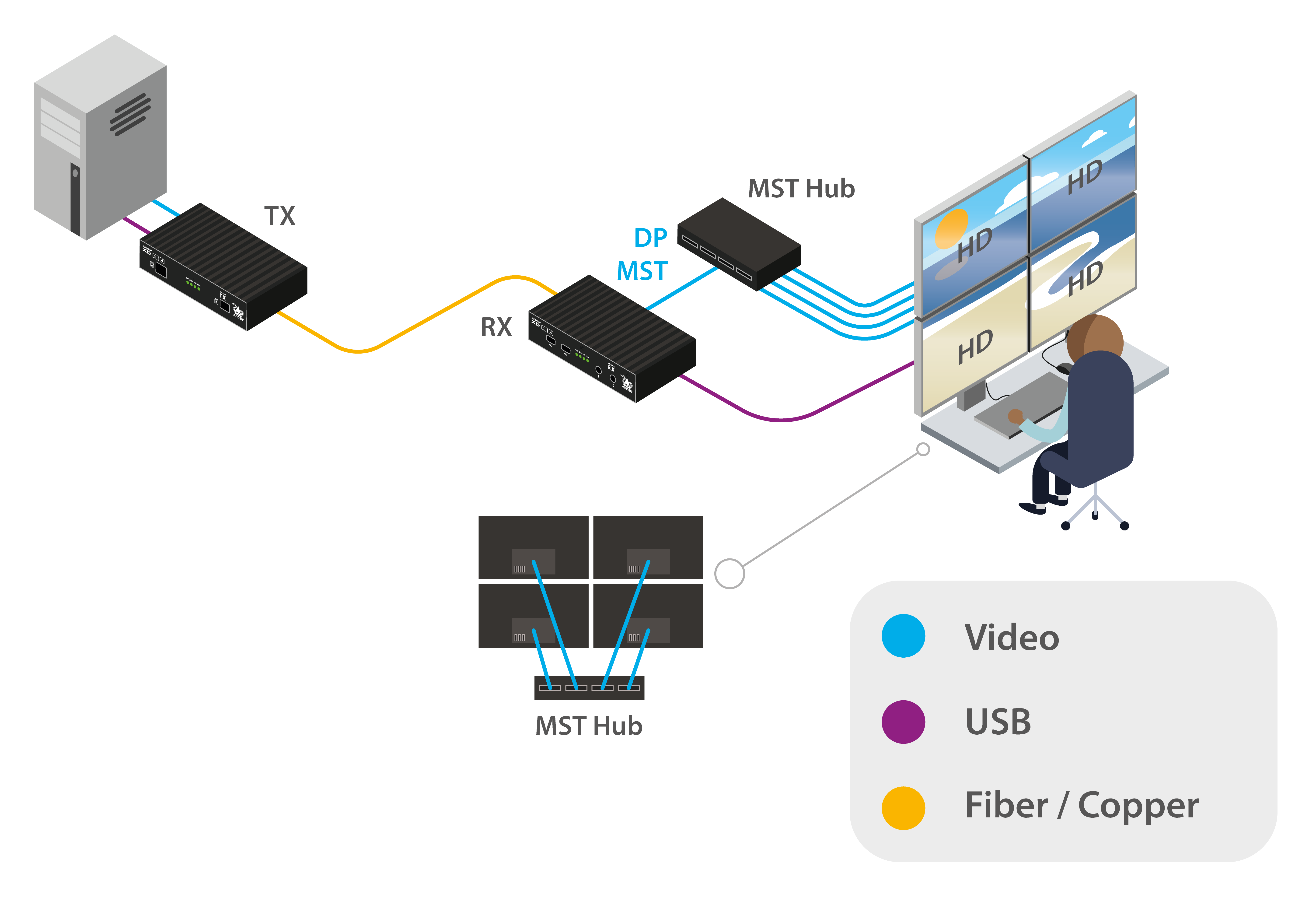 HD video, USB2.0 HID (human interface device) and audio are transmitted on a single CATx or fiber cable.