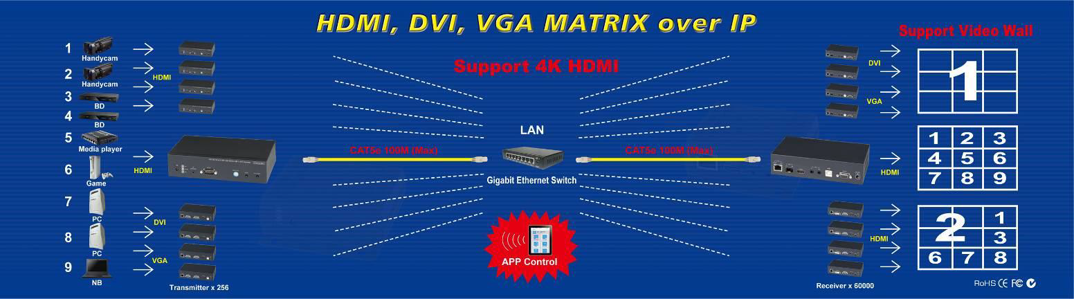 Support point to point and multiple source devices to multi-display connections via Gigabit network switch.