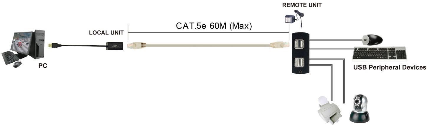 Extend four USB devices up to 60 meters over CAT5e cable.
