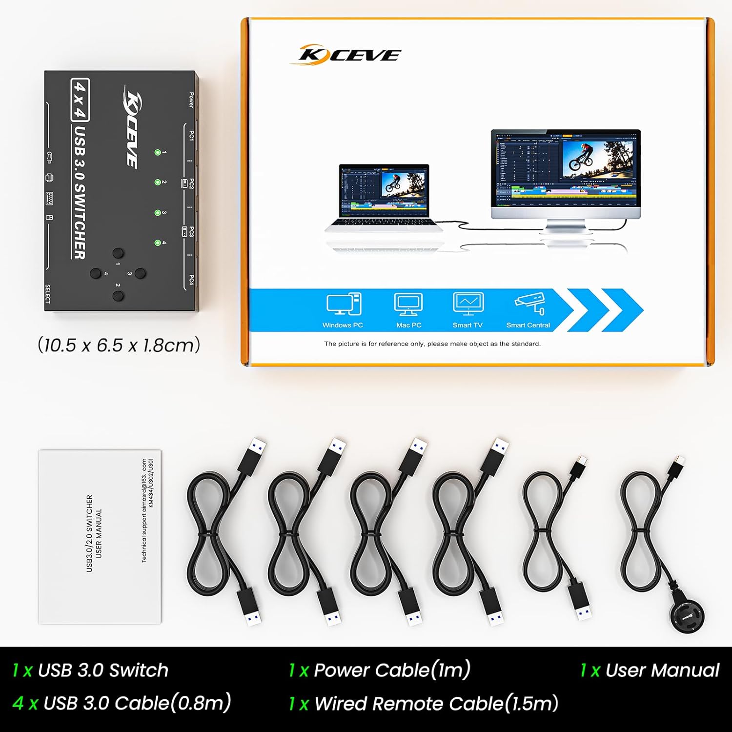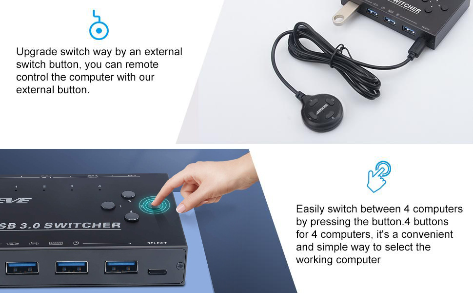 This USB 3.0 switch with 4 switches simply press the button to select the computer you want to control. Equipped with an external switching cable, you can remotely control the computer with this external button. Please note that this USB 3.0 switch does not support switching via keyboard hotkey.