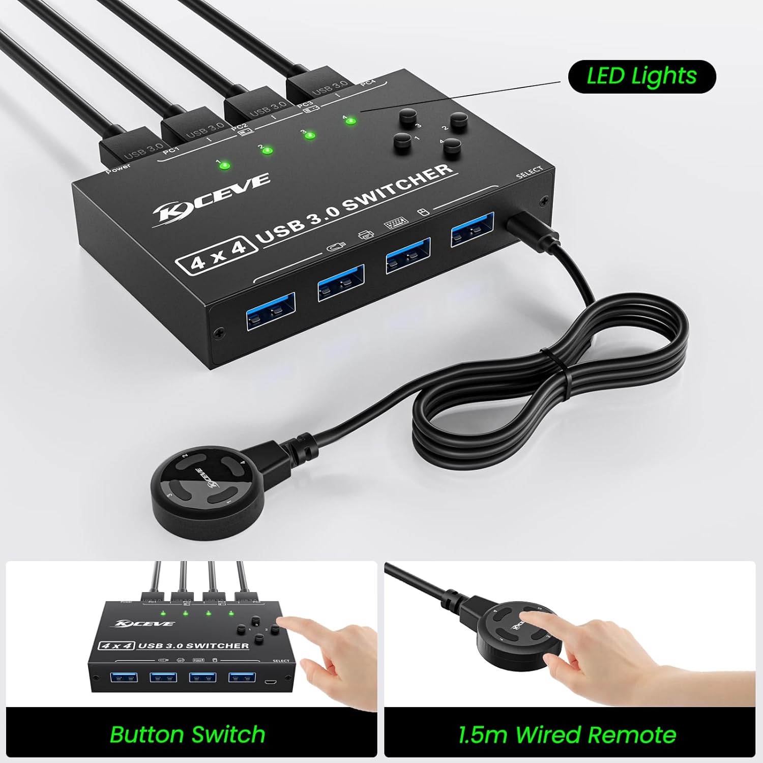 - One push of a button between 4 computers to share 4 USB 3.0 peripherals without constantly replacing cables or setting up complicated software for network sharing. The blue LED on the USB 3.0 switch shows the active computer.