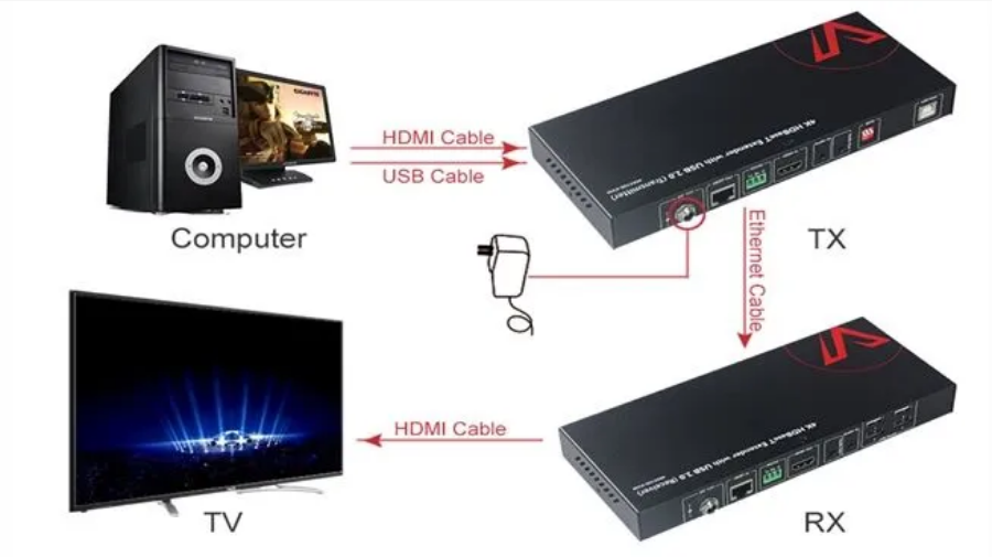 Transmits 4K@60Hz HDMI signal up to 100m/330ft over single CAT6/7 cable, along with stereo audio and USB 2.0 extension. Also supports 1080P@120Hz, ideal for PC game control.